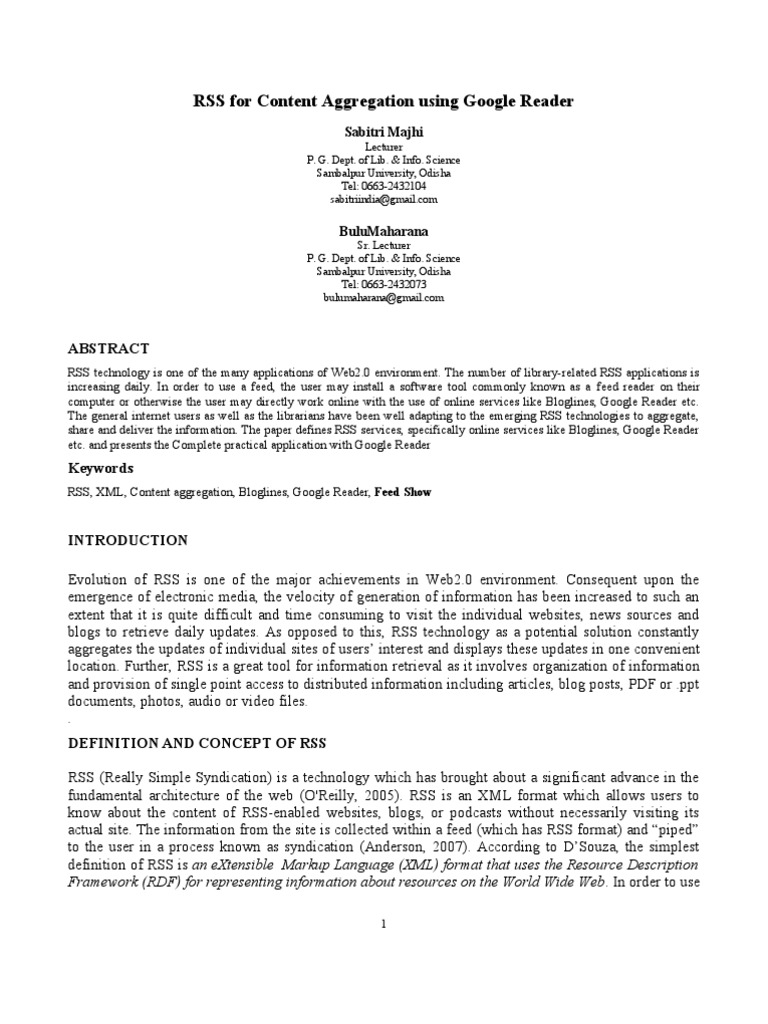 INTRODUCTION Evolution of RSS is one of the major achievements in Web2.0 environment. Consequent upon the emergence of electronic media, the velocity of generation of information has been increased to such an extent that it is quite difficult and time consuming to visit the individual websites, news sources and blogs to retrieve daily updates. As opposed to this, RSS technology as a potential solution constantly aggregates the updates of individual sites of users interest and displays these updates in one convenient location. Further, RSS is a great tool for information retrieval as it involves organization of information and provision of single point access to distributed information including articles, blog posts, PDF or .ppt documents, photos, audio or video files. . DEFINITION AND CONCEPT OF RSS RSS (Really Simple Syndication) is a technology which has brought about a significant advance in the fundamental architecture of the web (O'Reilly, 2005). RSS is an XML format which allows users to know about the content of RSS-enabled websites, blogs, or podcasts without necessarily visiting its actual site. The information from the site is collected within a feed (which has RSS format) and piped to the user in a process known as syndication (Anderson, 2007). According to DSouza, the simplest definition of RSS is an eXtensible Markup Language (XML) format that uses the Resource Description Framework (RDF) for representing information about resources on the World Wide Web . In order to use