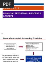 ASSETS = LIABILITIES + OWNERS EQUITY This is called the accounting equation. Given any two amounts, the accounting equation may be solved for the third, unknown amount. To illustrate, if the assets owned by a business amount to $100,000 and the liabilities are $30,000, the owners equity is $70,000 as shown: Assets Liabilities = Owners Equity $100,000 -$30,000 = $70,000 Financial Statements Income Statement The income statement reports the revenues and expenses for a period of time based on the matching concept (matches the expenses with the revenue generated by those expenses). The excess of revenue over expenses is called net income or net profit. If expenses exceed revenue, the excess is a net loss. Statement of Owners Equity The statement of owners equity reports the changes in the owners equity for a period of time. It is prepared after the income statement because the net income or net loss for the period must be reported in this statement. It is prepared before the balance sheet, since the amount of owners equity at the end of the period must be reported on the balance sheet. The statement of owners equity is viewed as a connecting link between the income statement and the balance sheet. Balance Sheet The balance sheet represents this accounting equation and presents a financial snapshot of the organization at a point in time. In the account format, the balance sheet shows the assets on the left side and the liabilities and owners equity on the right side just like the accounting equation. In the report format, the balance sheet presents the liabilities and owners equity sections below the assets section.