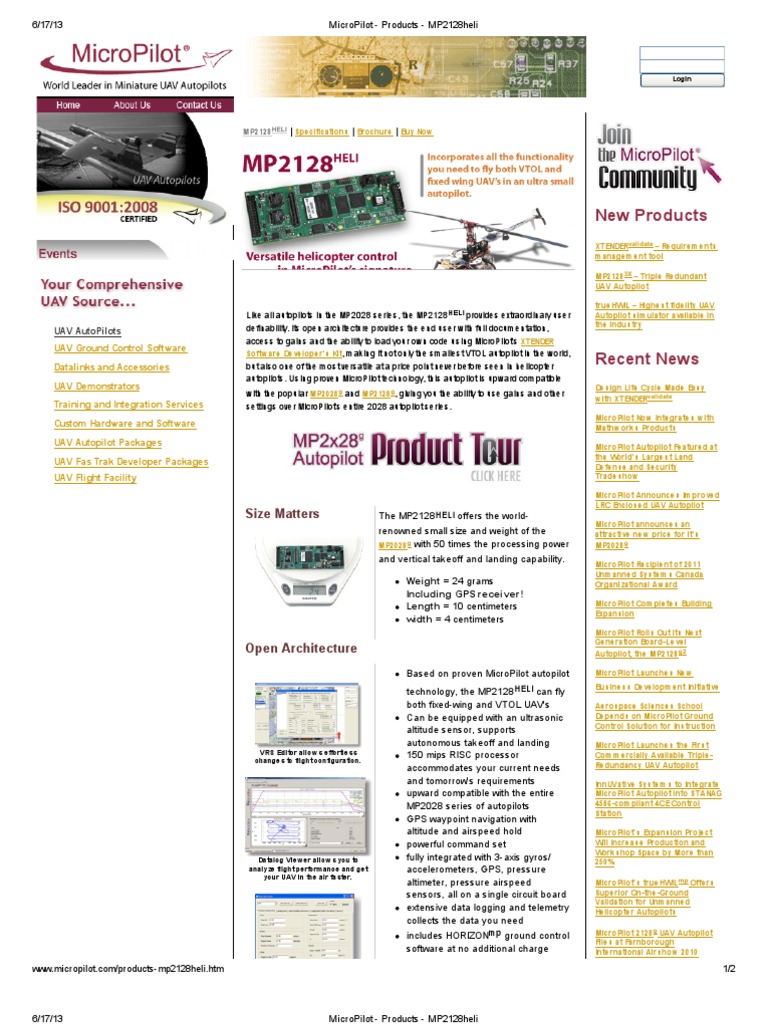 Design Life Cycle Made Easy w ith XTENDERvalidate MicroPilot Now Integrates w ith Mathw orks Products MicroPilot Autopilot Featured at the Worlds Largest Land Defense and Security Tradeshow MicroPilot Announces Im proved LRC Enclosed UAV Autopilot MicroPilot announces an attractive new price for it's MP2028g MicroPilot Recipient of 2011 Unm anned System s Canada Organizational Aw ard MicroPilot Com pletes Building Expansion MicroPilot Rolls Out its Next Generation Board-Level Autopilot, the MP2128g2