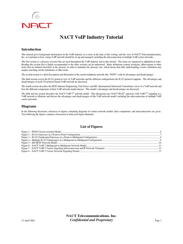 This tutorial gives background information on the VoIP industry as it exists at the time of this writing, and the view of NACT Telecommunications, Inc. as it pertains to how a large VoIP network should be set up and managed, including the interconnection of multiple VoIP carrier networks. The first section is a glossary of terms that are used throughout the VoIP industry and in this tutorial. The terms are organized in alphabetical order. Reading this section first is highly recommended so the other sections can be understood. Many definitions contain acronyms, abbreviations or other terms that are defined elsewhere in the glossary in order to minimize the glossary size, which means that fully understanding a terms definition may require searching out the definitions of other terms. The second section is a short description and illustration of the current telephone network (the PSTN) with its advantages and disadvantages. The third section covers the H.323 protocol view of VoIP networks and the different configurations the H.323 protocol supports. The advantages and disadvantages of an H.323 protocol-based VoIP network are discussed. The fourth section describes the IETF (Internet Engineering Task Force) and ISC (International Softswitch Consortium) views of a VoIP network and how the different components of their VoIP network model interact. This models advantages and disadvantages are discussed. The fifth and last section describes the NACT VoIP-7 network model. This discussion uses NACT IPAX gateways with VoIP-7 signaling in a VoIP network to illustrate and discuss the advantages and disadvantages of this VoIP network model, including the interconnection of multiple VoIP carrier networks.