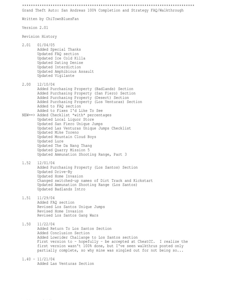 12/10/04 Added Purchasing Property (Badlands) Section Added Purchasing Property (San Fiero) Section Added Purchasing Property (Desert) Section Added Purchasing Property (Los Venturas) Section Added to FAQ section Added to Fixes I'd Like To See NEW==> Added Checklist *with* percentages Updated Local Liquor Store Updated San Fiero Unique Jumps Updated Las Venturas Unique Jumps Checklist Updated Mike Toreno Updated Mountain Cloud Boys Updated Lure Updated The Da Nang Thang Updated Quarry Mission 5 Updated Ammunation Shooting Range, Part 3 1.52 12/01/04 Added Purchasing Property (Los Santos) Section Updated Drive-By Updated Home Invasion Changed switched-up names of Dirt Track and Kickstart Updated Ammunation Shooting Range (Los Santos) Updated Badlands Intro 11/29/04 Added FAQ section Revised Los Santos Unique Jumps Revised Home Invasion Revised Los Santos Gang Wars 11/22/04 Added Return To Los Santos Section Added Conclusion Section Added Lowrider Challange to Los Santos section First version to - hopefully - be accepted at CheatCC. I realize the first version wasn't 100% done, but I've seen walkthrus posted only partially complete, so why mine was singled out for not being so...