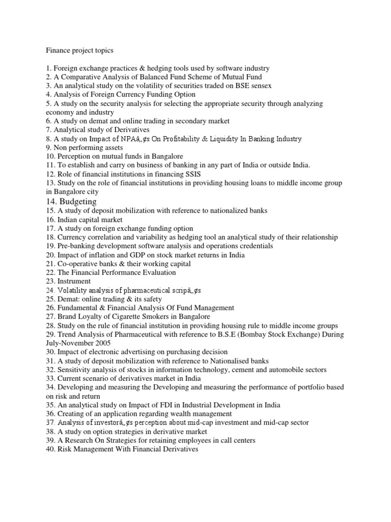 15. A study of deposit mobilization with reference to nationalized banks 16. Indian capital market 17. A study on foreign exchange funding option 18. Currency correlation and variability as hedging tool an analytical study of their relationship 19. Pre-banking development software analysis and operations credentials 20. Impact of inflation and GDP on stock market returns in India 21. Co-operative banks & their working capital 22. The Financial Performance Evaluation 23. Instrument 24. Volatility analysis of pharmaceutical scrips 25. Demat: online trading & its safety 26. Fundamental & Financial Analysis Of Fund Management 27. Brand Loyalty of Cigarette Smokers in Bangalore 28. Study on the rule of financial institution in providing housing rule to middle income groups 29. Trend Analysis of Pharmaceutical with reference to B.S.E (Bombay Stock Exchange) During July-November 2005 30. Impact of electronic advertising on purchasing decision 31. A study of deposit mobilization with reference to Nationalised banks 32. Sensitivity analysis of stocks in information technology, cement and automobile sectors 33. Current scenario of derivatives market in India 34. Developing and measuring the Developing and measuring the performance of portfolio based on risk and return 35. An analytical study on Impact of FDI in Industrial Development in India 36. Creating of an application regarding wealth management 37. Analysis of investors perception about mid-cap investment and mid-cap sector 38. A study on option strategies in derivative market 39. A Research On Strategies for retaining employees in call centers 40. Risk Management With Financial Derivatives