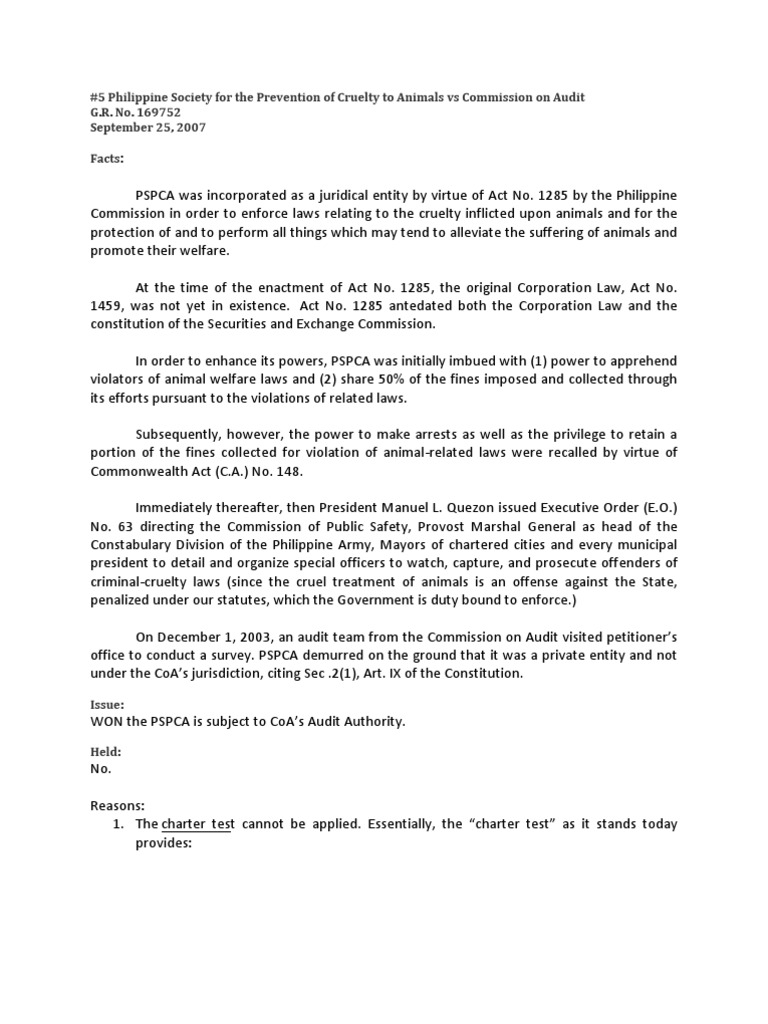 PSPCA was incorporated as a juridical entity by virtue of Act No. 1285 by the Philippine Commission in order to enforce laws relating to the cruelty inflicted upon animals and for the protection of and to perform all things which may tend to alleviate the suffering of animals and promote their welfare. At the time of the enactment of Act No. 1285, the original Corporation Law, Act No. 1459, was not yet in existence. Act No. 1285 antedated both the Corporation Law and the constitution of the Securities and Exchange Commission. In order to enhance its powers, PSPCA was initially imbued with (1) power to apprehend violators of animal welfare laws and (2) share 50% of the fines imposed and collected through its efforts pursuant to the violations of related laws. Subsequently, however, the power to make arrests as well as the privilege to retain a portion of the fines collected for violation of animal-related laws were recalled by virtue of Commonwealth Act (C.A.) No. 148. Immediately thereafter, then President Manuel L. Quezon issued Executive Order (E.O.) No. 63 directing the Commission of Public Safety, Provost Marshal General as head of the Constabulary Division of the Philippine Army, Mayors of chartered cities and every municipal president to detail and organize special officers to watch, capture, and prosecute offenders of criminal-cruelty laws (since the cruel treatment of animals is an offense against the State, penalized under our statutes, which the Government is duty bound to enforce.) On December 1, 2003, an audit team from the Commission on Audit visited petitioners office to conduct a survey. PSPCA demurred on the ground that it was a private entity and not under the CoAs jurisdiction, citing Sec .2(1), Art. IX of the Constitution.