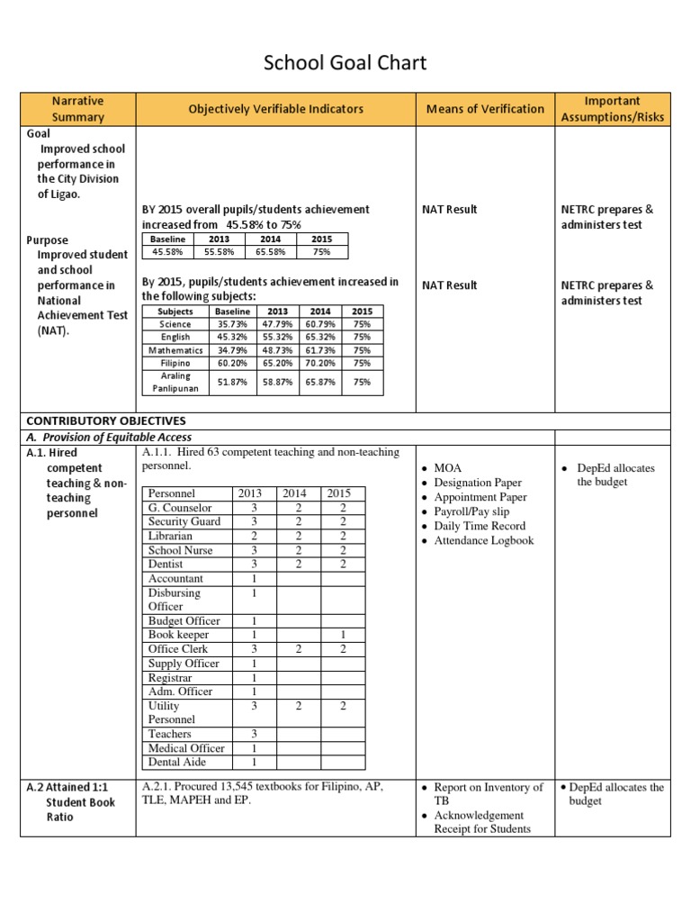 Goal Improved school performance in the City Division of Ligao. BY 2015 overall pupils/students achievement increased from 45.58% to 75% Purpose Improved student and school performance in National Achievement Test (NAT).