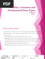 Constants Constants refer to values that do not change during the execution of the program. Examples for constants are 1998 25.789 Hello World a Integer constant Floating point constant String constant Character constant