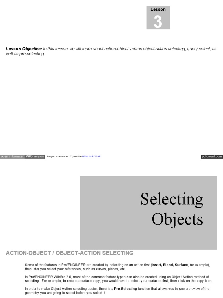 Some of the features in Pro/ENGINEER are created by selecting on an action first (Insert, Blend, Surface , for example), then later you select your references, such as curves, planes, etc. In Pro/ENGINEER Wildfire 2.0, most of the common feature types can also be created using an Object-Action method of selecting. For example, to create a surface copy, you would have to select your surfaces first, then click on the copy icon. In order to make Object-Action selecting easier, there is a Pre-Selecting function that allows you to see a preview of the geometry you are going to select before you select it.