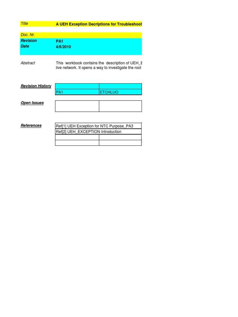 This workbook contains the description of UEH_EXCEPTION Codes for troubleshooting purpose in the live network. It opens a way to investigate the root cause of the problem in depth step by step.