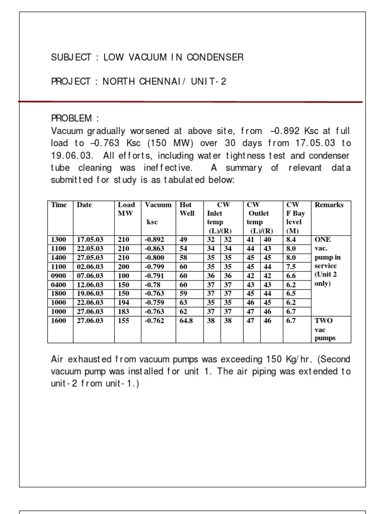 PROBLEM : Vacuum gradually worsened at above site, from load to 0.763 Ksc (150 MW) over 30 days 19.06.03. All efforts, including water tightness tube cleaning was ineffective. A summary submitted for study is as tabulated below: