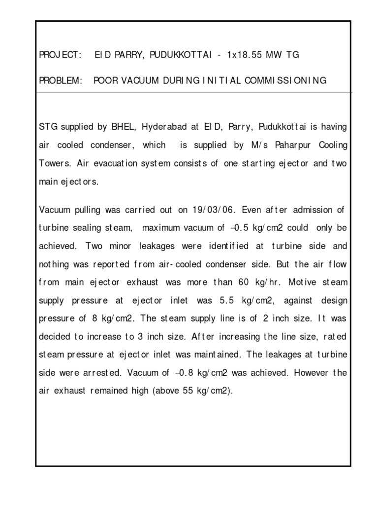 Towers. Air evacuation system consists of one starting ejector and two main ejectors. Vacuum pulling was carried out on 19/03/06. Even after admission of turbine sealing steam, maximum vacuum of 0.5 kg/cm2 could only be achieved. Two minor leakages were identified at turbine side and nothing was reported from air-cooled condenser side. But the air flow from main ejector exhaust was more than 60 kg/hr. Motive steam supply pressure at ejector inlet was 5.5 kg/cm2, against design pressure of 8 kg/cm2. The steam supply line is of 2 inch size. It was decided to increase to 3 inch size. After increasing the line size, rated steam pressure at ejector inlet was maintained. The leakages at turbine side were arrested. Vacuum of 0.8 kg/cm2 was achieved. However the air exhaust remained high (above 55 kg/cm2).