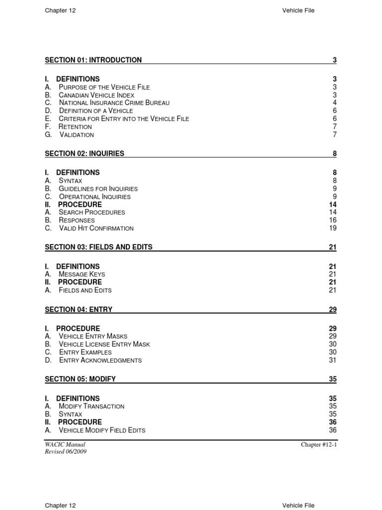 SECTION 02: INQUIRIES I. DEFINITIONS A. SYNTAX B. GUIDELINES FOR INQUIRIES C. OPERATIONAL INQUIRIES II. PROCEDURE A. SEARCH PROCEDURES B. RESPONSES C. VALID HIT CONFIRMATION SECTION 03: FIELDS AND EDITS I. DEFINITIONS A. MESSAGE KEYS II. PROCEDURE A. FIELDS AND EDITS SECTION 04: ENTRY I. PROCEDURE A. VEHICLE ENTRY MASKS B. VEHICLE LICENSE ENTRY MASK C. ENTRY EXAMPLES D. ENTRY ACKNOWLEDGMENTS SECTION 05: MODIFY I. DEFINITIONS A. MODIFY TRANSACTION B. SYNTAX II. PROCEDURE A. VEHICLE MODIFY FIELD EDITS