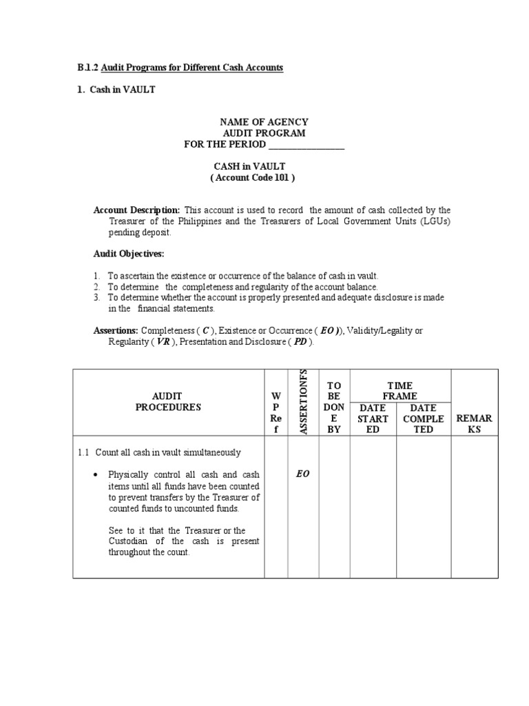 Cash in VAULT NAME OF AGENCY AUDIT PROGRAM FOR THE PERIOD ________________ CASH in VAULT ( Account Code 101 ) Account Description: This account is used to record the amount of cash collected by the Treasurer of the Philippines and the Treasurers of Local Government Units (LGUs) pending deposit. Audit Objectives: 1. To ascertain the existence or occurrence of the balance of cash in vault. 2. To determine the completeness and regularity of the account balance. 3. To determine whether the account is properly presented and adequate disclosure is made in the financial statements. Assertions: Completeness ( C ), Existence or Occurrence ( EO )), Validity/Legality or Regularity ( VR ), Presentation and Disclosure ( PD ). ASSERTIONFS