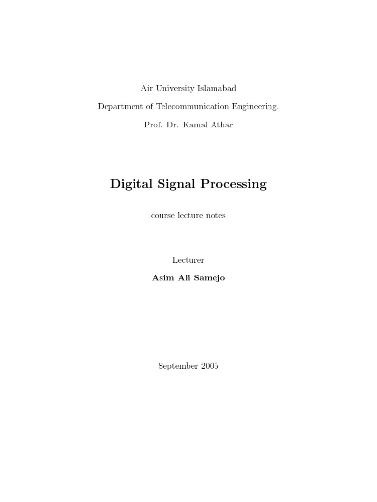 - software realizations of operations on a signal, which are carried out on a digital computer ( software implementation of system) - digital hardware realizations (logical circuits) congured such that they are able to perform the processing operations, or - most general denition: a combination of both Digital signal processing: Processing of signals by digital means (software and/or hardware) Includes Conversion from analog to digital domain and back (physical signals are analog) Mathematical specication of the processing operations Algorithm: method or set of rules for implementing the system by a program that performs the corresponding mathematical operations. Emphasis on computationally ecient algorithms, which are fast and easily implemented. why Digital?