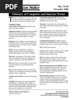 Part 1 Fill in the Blank The purpose of this assignment is for you to learn commonly used terms related to computers. Definitions and examples are listed below. Read each definition and then complete the fill-inthe-blank section. Hardware The physical components of the computer system, such as the hard drive, disc drives, and modem. Software The programs or instructions that tell the computer what to do, such as word processors, spreadsheets, and databases. CPU The brain of the computer or Central Processing Unit. ROM The permanent memory that is built in your computer. This is Read-Only Memory. RAM The computers working memory, sometimes called RandomAccessed memory. Megabyte Approximately a million bytes (a measure of storage). Gigabyte Approximately a billion bytes (or 1,000) megabytes. Input Device The hardware that is used to pass information into the computer, such as a mouse, keyboard, or microphone. Output Device The hardware that receives and displays information coming from the computer, such as a monitor, printer, or speakers. Modem The device that allows your computer to talk to other computers over a telephone line. Monitor A video or computer display device that contains a screen. Laser Printer A printer that uses both laser and photographic technology to produce high quality output. Printer The hardware that provides printed output from the computer. Hard Copy A printed copy of computer output. Compact Disc A disc on which a laser has digitally recorded information such as audio, video, or computer data. Hard Disk A fixed, large-capacity magnetic storage medium for computer data; this is inside the computer. Floppy Disk A portable magnetic storage medium for computer data that allows users to randomly access information. Graphical User Interface The use of graphical symbols instead of text commands to control common computer functions such as copying programs and disks. Icon A small picture or symbol representing a computer hardware function or component. Ink-jet Printer A type of printer that forms letters on the page by shooting tiny electrically charged droplets of ink. Peripheral Any hardware attached to the CPU, whether it be an input, output, or storage device.