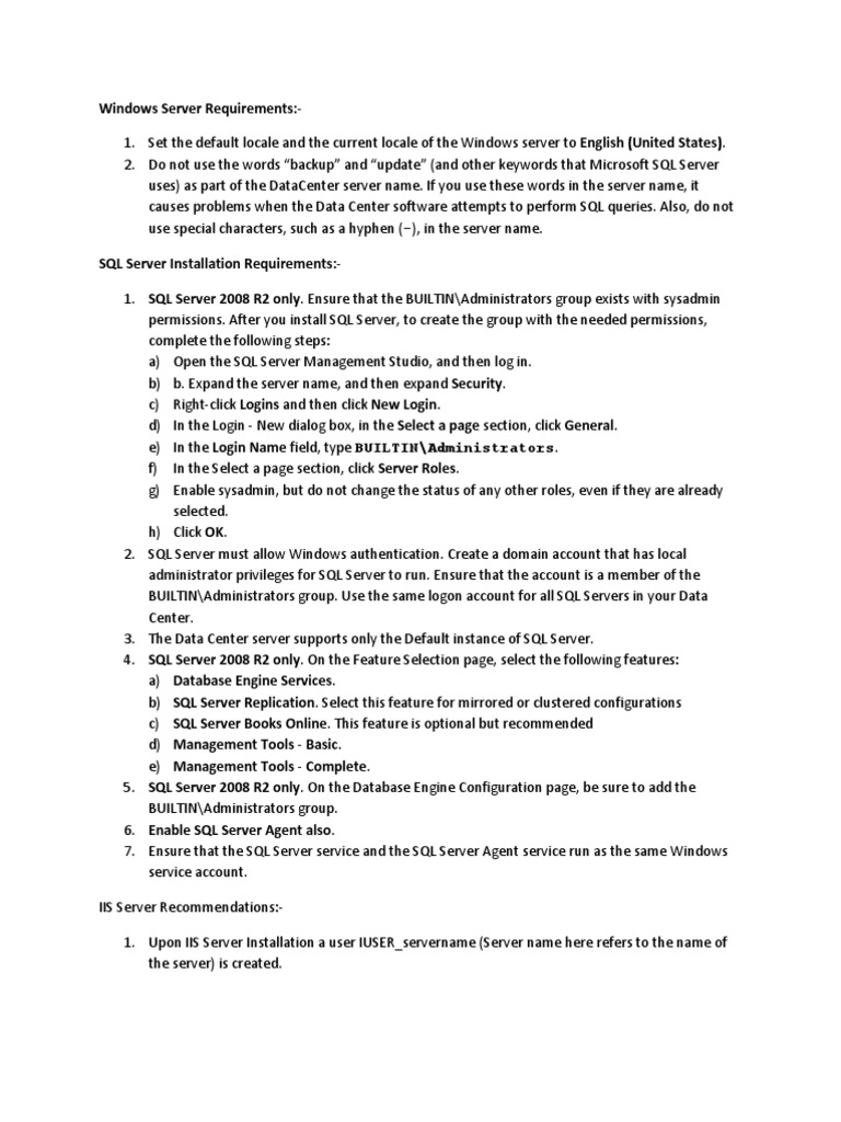 Set the default locale and the current locale of the Windows server to English (United States). 2. Do not use the words backup and update (and other keywords that Microsoft SQL Server uses) as part of the DataCenter server name. If you use these words in the server name, it causes problems when the Data Center software attempts to perform SQL queries. Also, do not use special characters, such as a hyphen (-), in the server name. SQL Server Installation Requirements:1. SQL Server 2008 R2 only. Ensure that the BUILTIN\Administrators group exists with sysadmin permissions. After you install SQL Server, to create the group with the needed permissions, complete the following steps: a) Open the SQL Server Management Studio, and then log in. b) b. Expand the server name, and then expand Security. c) Right-click Logins and then click New Login. d) In the Login - New dialog box, in the Select a page section, click General. e) In the Login Name field, type BUILTIN\Administrators. f) In the Select a page section, click Server Roles. g) Enable sysadmin, but do not change the status of any other roles, even if they are already selected. h) Click OK. 2. SQL Server must allow Windows authentication. Create a domain account that has local administrator privileges for SQL Server to run. Ensure that the account is a member of the BUILTIN\Administrators group. Use the same logon account for all SQL Servers in your Data Center. 3. The Data Center server supports only the Default instance of SQL Server. 4. SQL Server 2008 R2 only. On the Feature Selection page, select the following features: a) Database Engine Services. b) SQL Server Replication. Select this feature for mirrored or clustered configurations c) SQL Server Books Online. This feature is optional but recommended d) Management Tools - Basic. e) Management Tools - Complete. 5. SQL Server 2008 R2 only. On the Database Engine Configuration page, be sure to add the BUILTIN\Administrators group. 6. Enable SQL Server Agent also. 7. Ensure that the SQL Server service and the SQL Server Agent service run as the same Windows service account. IIS Server Recommendations:1. Upon IIS Server Installation a user IUSER_servername (Server name here refers to the name of the server) is created.