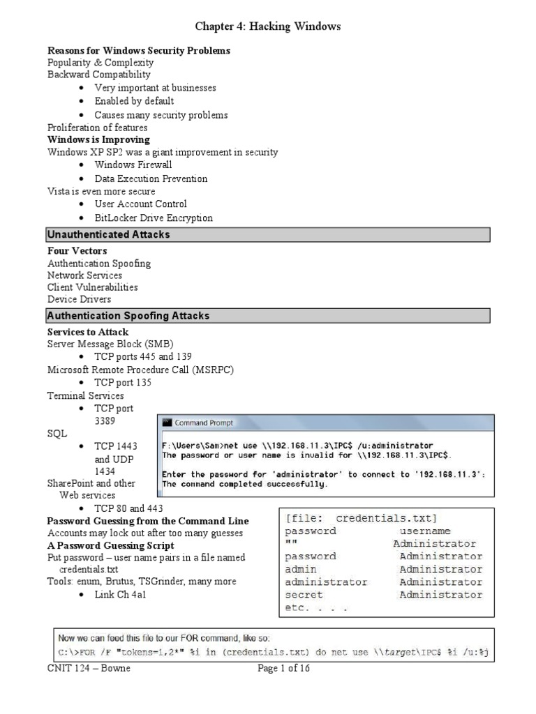 Reasons for Windows Security Problems Popularity & Complexity Backward Compatibility Very important at businesses Enabled by default Causes many security problems Proliferation of features Windows is Improving Windows XP SP2 was a giant improvement in security Windows Firewall Data Execution Prevention Vista is even more secure User Account Control BitLocker Drive Encryption Unauthenticated Attacks Four Vectors Authentication Spoofing Network Services Client Vulnerabilities Device Drivers Authentication Spoofing Attacks Services to Attack Server Message Block (SMB) TCP ports 445 and 139 Microsoft Remote Procedure Call (MSRPC) TCP port 135 Terminal Services TCP port 3389 SQL TCP 1443 and UDP 1434 SharePoint and other Web services TCP 80 and 443 Password Guessing from the Command Line Accounts may lock out after too many guesses A Password Guessing Script Put password user name pairs in a file named credentials.txt Tools: enum, Brutus, TSGrinder, many more Link Ch 4a1