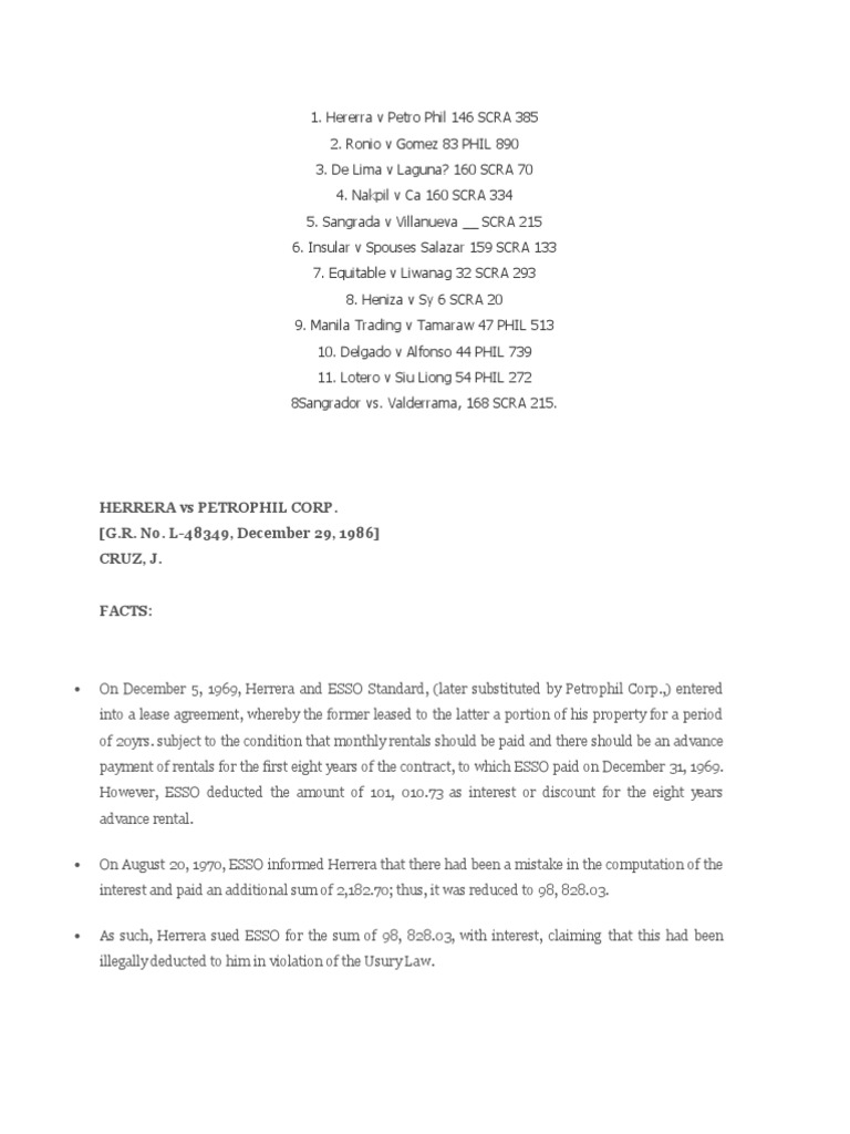 On December 5, 1969, Herrera and ESSO Standard, (later substituted by Petrophil Corp.,) entered into a lease agreement, whereby the former leased to the latter a portion of his property for a period of 20yrs. subject to the condition that monthly rentals should be paid and there should be an advance payment of rentals for the first eight years of the contract, to which ESSO paid on December 31, 1969. However, ESSO deducted the amount of 101, 010.73 as interest or discount for the eight years advance rental.