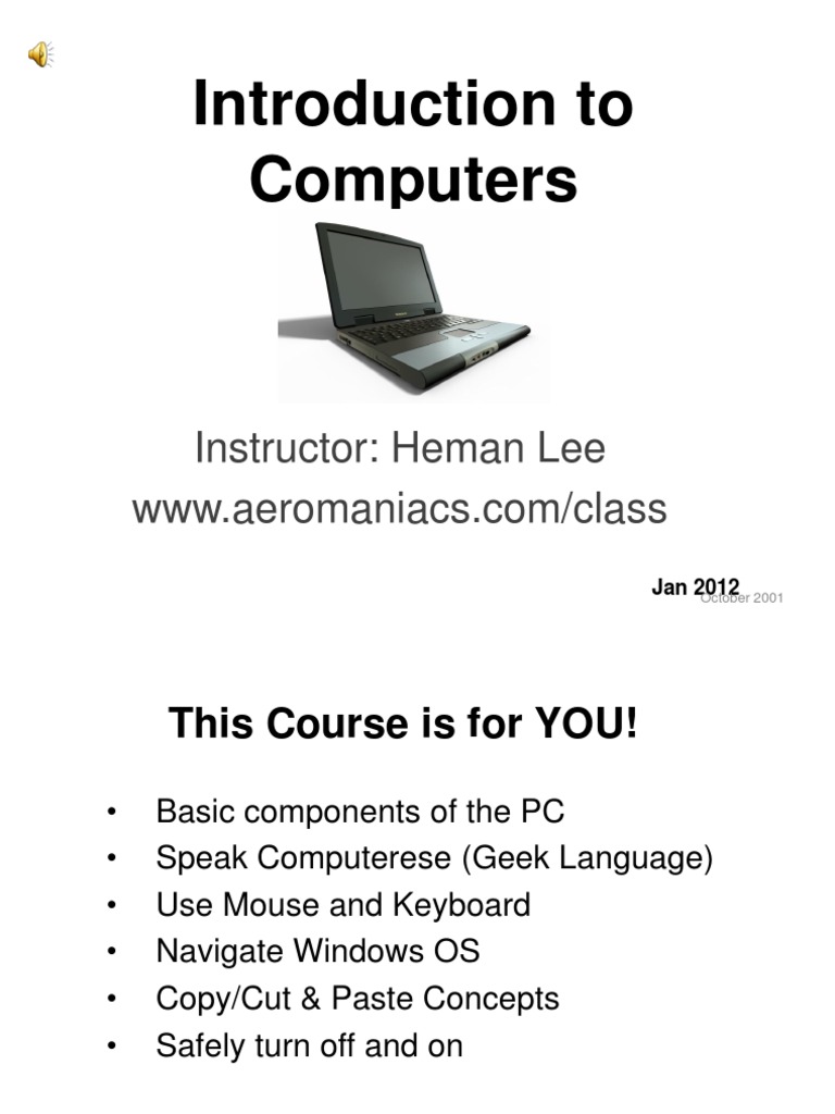 Basic components of the PC Speak Computerese (Geek Language) Use Mouse and Keyboard Navigate Windows OS Copy/Cut & Paste Concepts Safely turn off and on