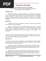 attracting capable applicants for employment.The Process begins when new recruits are sought and ends when their applications aresubmitted. The result is a pool of application from which new employees are selected. MEANING OF RECRUITMENT: Recruitment is understood as the process of searching for and obtaining applicants for jobs,from among them the right people can be selected. Though theoretically recruitmentprocess is said to end with the receipt of applications, in practice the activity extends to thescreening of applications so as to eliminate those who are not qualified for the job. PURPOSE AND IMPORTANCE OF RECRUITMENT: 1.Determine the present and future requirements in conjunction with personn elplanning and job analysis activities2.Increase the pool of job candidates at minimum cost3.Help increase success rate of selection process by reducing number of u nder-qualified or over-qualified applications.4.Reduce the probability that job applicants once selected would leave shortly5.Meet legal and social obligations6.Identify and prepare potential job applicants7.Evaluate effectiveness of various recruitment techniques and sources for jobapplicants. FACTORS GOVERNING RECRUITMENT External Factors: Demand and Supply (Specific Skills) Unemployment Rate (Area-wise) Labor Market Conditions Political and Legal Environment (Reservations, Labor laws) Image
