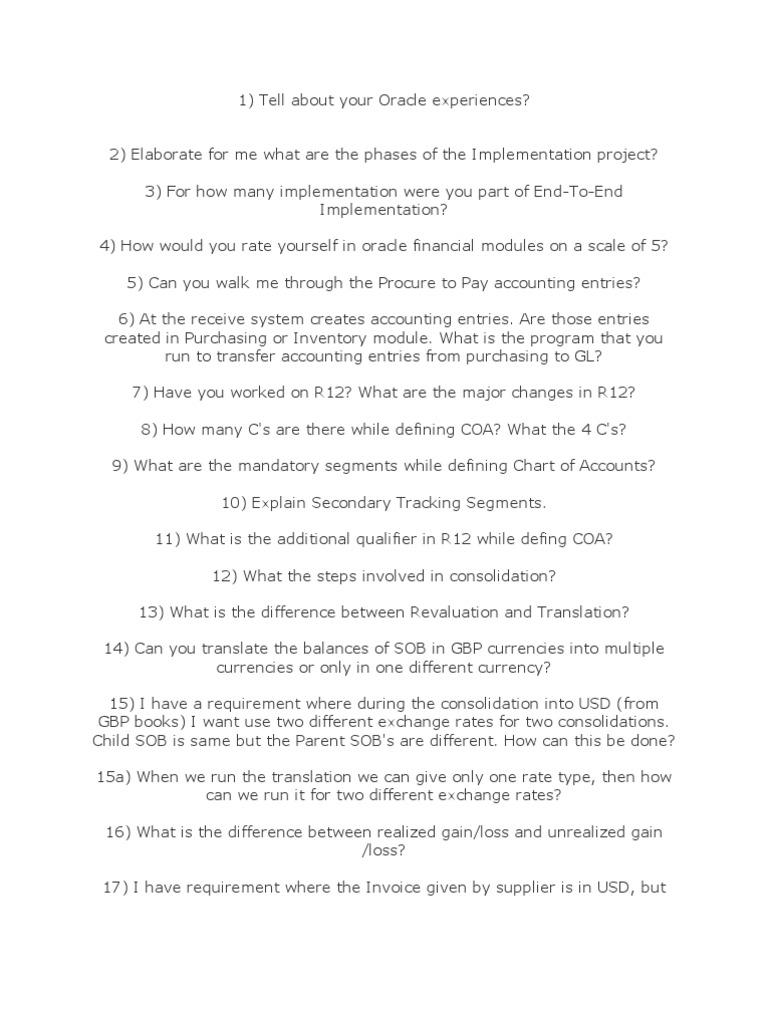 Below were the questions asked recently in an Interview for Finance Functional of 5+ years experience General - Tell about yourself and your experience - How many implementations & Support projects? Accounts Receivable - Explain Quote to Cash Process with Accounting Entries - What are the parameters of the Auto-Invoice Program? - How is the GL Date derived by AutoInvoice process? Any set-ups? - What is the use of the Default GL Date given in parameters of the Autoinvoice import program? - Can it be set that the GL date is the Sale Order date or Ship to Date? - Can multiple Sales Orders be invoiced under one Invoice? - Can Adjustments be imported? - Can Credit memo be imported and applied to the transactions via Autoinvoice? - Grouping Rules and Line Ordering Rules - Allow Overapplication option - Invoice in Arrears - Is it possible to import invoices of a specific Sales Order? - Can closed AR Invoices be imported using AutoInvoice? Payables