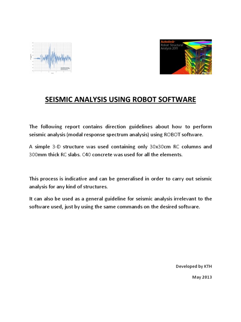 The following report contains direction guidelines about how to perform seismic analysis (modal response spectrum analysis) using ROBOT software. A simple 3-D structure was used containing only 30x30cm RC columns and 300mm thick RC slabs. C40 concrete was used for all the elements.