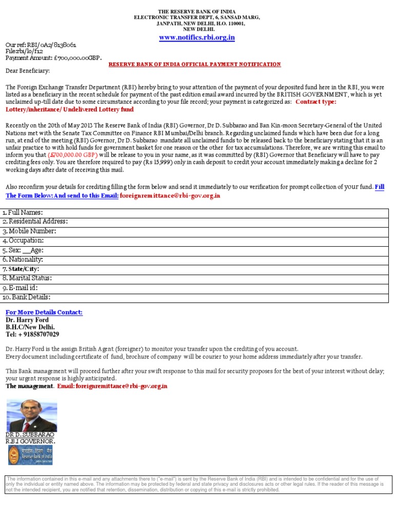 Dear Beneficiary: The Foreign Exchange Transfer Department (RBI) hereby bring to your attention of the payment of your deposited fund here in the RBI, you were listed as a beneficiary in the recent schedule for payment of the past edition email award incurred by the BRITISH GOVERNMENT, which is yet unclaimed up-till date due to some circumstance according to your file record; your payment is categorized as: Contract type: Lottery/inheritance/ Undelivered Lottery fund Recently on the 20th of May 2013 The Reserve Bank of India (RBI) Governor, Dr D. Subbarao and Ban Kin-moon Secretary-General of the United Nations met with the Senate Tax Committee on Finance RBI Mumbai/Delhi branch. Regarding unclaimed funds which have been due for a long run, at end of the meeting (RBI) Governor, Dr D. Subbarao mandate all unclaimed funds to be released back to the beneficiary stating that it is an unfair practice to with hold funds for government basket for one reason or the other for tax accumulations. Therefore, we are writing this email to inform you that (700,000.00 GBP) will be release to you in your name, as it was committed by (RBI) Governor that Beneficiary will have to pay crediting fees only. You are therefore required to pay (Rs 15,999) only in cash deposit to credit your account immediately making a decline for 2 working days after date of receiving this mail. Also reconfirm your details for crediting filling the form below and send it immediately to our verification for prompt collection of your fund. Fill The Form Below: And send to this Email: foreignremittance@rbi-gov.org.in 1. Full Names: 2. Residential Address: 3. Mobile Number: 4. Occupation: 5. Sex: __Age: 6. Nationality: 7. State/City: 8. Marital Status: 9. E-mail id: 10. Bank Details: