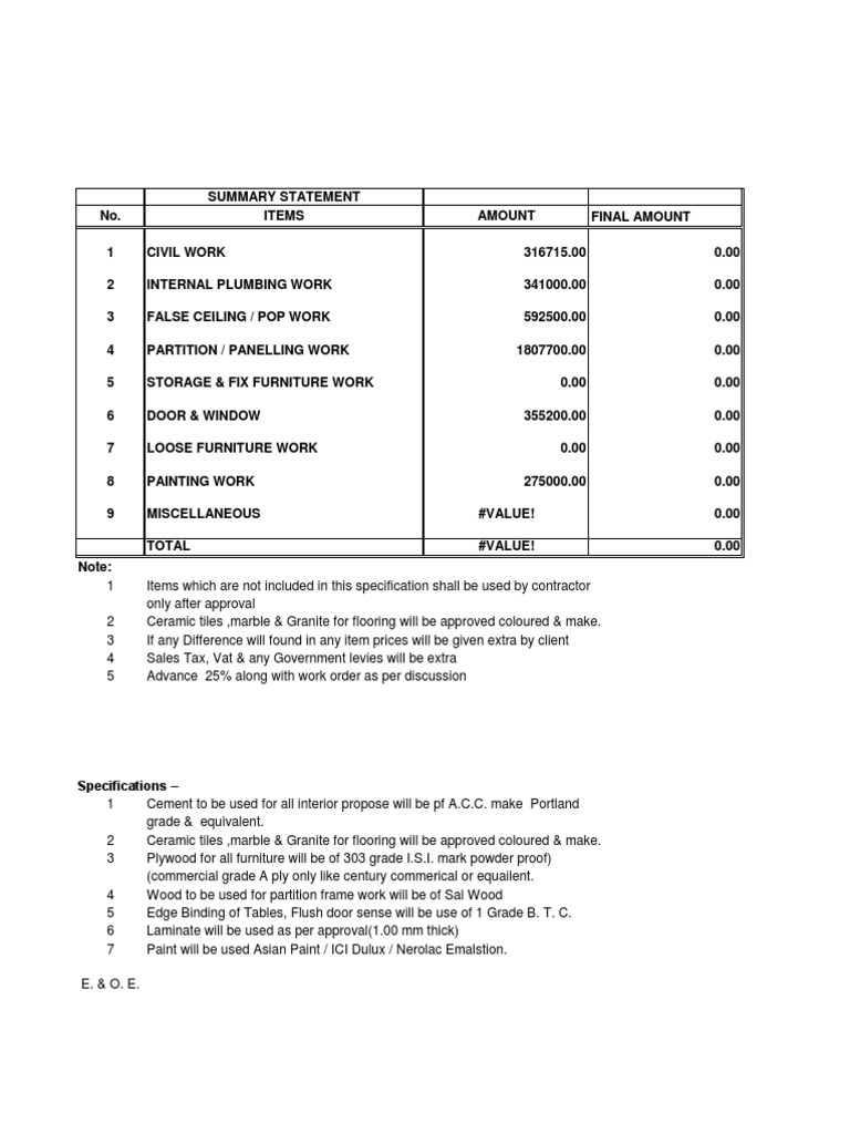 SUMMARY STATEMENT ITEMS CIVIL WORK INTERNAL PLUMBING WORK FALSE CEILING / POP WORK PARTITION / PANELLING WORK STORAGE & FIX FURNITURE WORK DOOR & WINDOW LOOSE FURNITURE WORK PAINTING WORK MISCELLANEOUS TOTAL