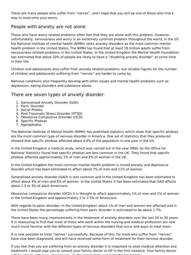 The National Institute of Mental Health (NIMH) has published statistics which show that specific phobias are the most common type of nervous disorder in America. One set of statistics that they produced showed that specific phobias affected about 4.4% of the population in one year in the US. In the United Kingdom a medical study, which was carried out in the year 2000, by the Office for National Statistics found that specific phobias are less common in the UK. They found that specific phobias affected approximately 1% of men and 2% of women in the UK. In the United Kingdom the most common mental health problem is mixed anxiety and depressive disorder which has been estimated to affect about 7% of men and 11% of women. Generalised anxiety disorder (GAD) is less common and in the United Kingdom has been estimated to affect about 4% of men and 5% of women. In the United States it has been estimated that GAD affects about 2.5 to 3% of adult Americans. Obsessive compulsive disorder (OCD) it is thought to affect approximately 1% of men and 1% of women in the United Kingdom and approximately 2 to 2.5% of Americans. With regards to panic disorder, in the United Kingdom about 1% of men and women are affected and in the United States the percentage suffering from panic disorder is estimated to be about 1.7%. There have been many improvements in the treatment of anxiety disorders over the last 20 to 30 years. It is reassuring to find that most of those who work within the nursing and medical profession are now much more familiar with the different types of nervous disorders that occur and ways to treat them. It is now possible to treat nerves successfully. Because of this, far more who suffer from nerves have now been diagnosed, and will have received some form of treatment for their nervous disorder. If you feel that you are suffering from an anxiety disorder it is important to seek medical attention and treatment. I would urge you to consult your family doctor or GP in the first instance. Your family doctor will be able to refer you, if necessary, to the appropriate specialist for treatment.