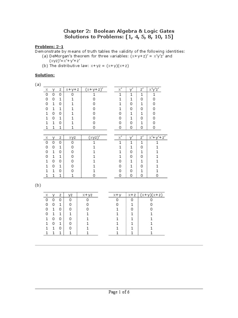 Chapter 2: Boolean Algebra & Logic Gates Solutions to Problems: [1, 4, 5, 8, 10, 15]