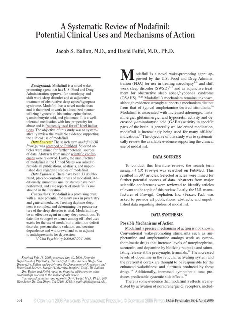 Background: Modafinil is a novel wakepromoting agent that has U.S. Food and Drug Administration approval for narcolepsy and shift work sleep disorder and as adjunctive treatment of obstructive sleep apnea/hypopnea syndrome. Modafinil has a novel mechanism and is theorized to work in a localized manner, utilizing hypocretin, histamine, epinephrine, -aminobutyric acid, and glutamate. It is a welltolerated medication with low propensity for abuse and is frequently used for off-label indications. The objective of this study was to systematically review the available evidence supporting the clinical use of modafinil. Data Sources: The search term modafinil OR Provigil was searched on PubMed. Selected articles were mined for further potential sources of data. Abstracts from major scientific conferences were reviewed. Lastly, the manufacturer of modafinil in the United States was asked to provide all publications, abstracts, and unpublished data regarding studies of modafinil. Data Synthesis: There have been 33 doubleblind, placebo-controlled trials of modafinil. Additionally, numerous smaller studies have been performed, and case reports of modafinils use abound in the literature. Conclusions: Modafinil is a promising drug with a large potential for many uses in psychiatry and general medicine. Treating daytime sleepiness is complex, and determining the precise nature of the sleep disorder is vital. Modafinil may be an effective agent in many sleep conditions. To date, the strongest evidence among off-label uses exists for the use of modafinil in attention-deficit disorder, postanesthetic sedation, and cocaine dependence and withdrawal and as an adjunct to antidepressants for depression. (J Clin Psychiatry 2006;67:554566)