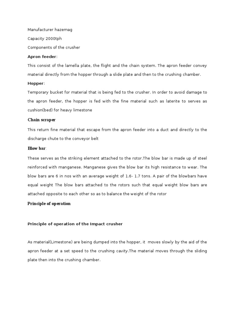 Manufacturer hazemag Capacity 2000tph Components of the crusher Apron feeder: This consist of the lamella plate, the