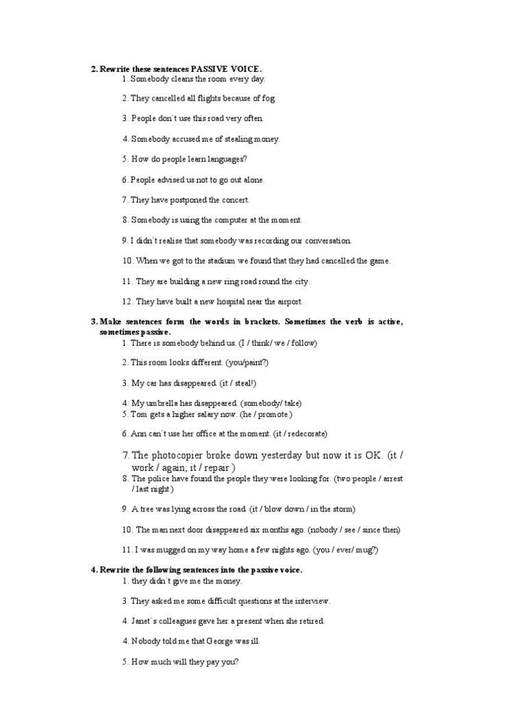 8. The police have found the people they were looking for. (two people / arrest / last night ) 9. A tree was lying across the road. (it / blow down / in the storm) 10. The man next door disappeared six months ago. (nobody / see / since then) 11. I was mugged on my way home a few nights ago. (you / ever/ mug?) 4. Rewrite the following sentences into the passive voice. 1. they didn`t give me the money. 3. They asked me some difficult questions at the interview. 4. Janet`s colleagues gave her a present when she retired. 4. Nobody told me that George was ill. 5. How much will they pay you?