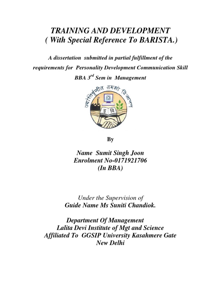 This is to certify that the Dissertation title of customer satisfaction of Barista Company is bonafide & original Research work done by Name Sumit Singh Joon Student of BBA 3 rd sem GGSIP University, Under my supervision and guidance.