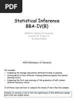equality of two or more population (or treatment) means by examining the variances of samples that are taken. ANOVA allows one to determine whether the differences between the samples are simply due to random error (sampling errors) or whether there are systematic treatment effects that causes the mean in one group to differ from the mean in another. Most of the time ANOVA is used to compare the equality of three or more means, however when the means from two samples are compared using ANOVA it is equivalent to using a t-test to compare the means of independent samples. ANOVA is based on comparing the variance (or variation) between the data samples to variation within each particular sample. If the between variation is much larger than the within variation, the means of different samples will not be equal. If the between and within variations are approximately the same size, then there will be no significant difference between sample means. Assumptions of ANOVA: (i) All populations involved follow a normal distribution. (ii) All populations have the same variance (or standard deviation). (iii) The samples are randomly selected and independent of one another. Since ANOVA assumes the populations involved follow a normal distribution, ANOVA falls into a category of hypothesis tests known as parametric tests. If the populations involved did not follow a normal distribution, an ANOVA test could not be used to examine the equality of the sample means. Instead, one would have to use a non-parametric test (or distribution-free test), which is a more general form of hypothesis testing that does not rely on distributional assumptions. Example Consider this example: Suppose the National Transportation Safety Board (NTSB) wants to examine the safety of compact cars, midsize cars, and full-size cars. It collects a sample of three for each of the treatments (cars types). Using the hypothetical data provided below, test whether the mean pressure applied to the drivers head during a crash test is equal for each types of car. Use = 5%. Table ANOVA.1 Compact cars Midsize cars 643 469 655 427 702 525 666.67 473.67 X S 31.18 49.17