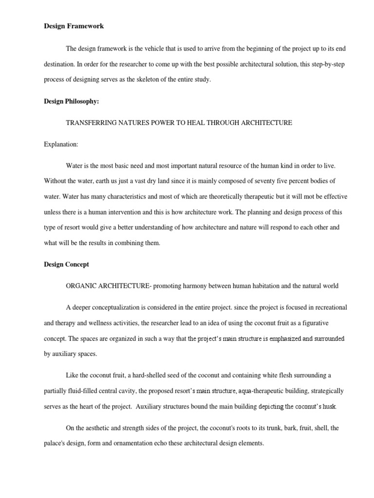 The design framework is the vehicle that is used to arrive from the beginning of the project up to its end destination. In order for the researcher to come up with the best possible architectural solution, this step-by-step process of designing serves as the skeleton of the entire study. Design Philosophy: TRANSFERRING NATURES POWER TO HEAL THROUGH ARCHITECTURE Explanation: Water is the most basic need and most important natural resource of the human kind in order to live. Without the water, earth us just a vast dry land since it is mainly composed of seventy five percent bodies of water. Water has many characteristics and most of which are theoretically therapeutic but it will mot be effective unless there is a human intervention and this is how architecture work. The planning and design process of this type of resort would give a better understanding of how architecture and nature will respond to each other and what will be the results in combining them. Design Concept ORGANIC ARCHITECTURE- promoting harmony between human habitation and the natural world A deeper conceptualization is considered in the entire project. since the project is focused in recreational and therapy and wellness activities, the researcher lead to an idea of using the coconut fruit as a figurative concept. The spaces are organized in such a way that the projects main structure is emphasized and surrounded by auxiliary spaces. Like the coconut fruit, a hard-shelled seed of the coconut and containing white flesh surrounding a partially fluid-filled central cavity, the proposed resorts main structure, aqua-therapeutic building, strategically serves as the heart of the project. Auxiliary structures bound the main building depicting the coconuts husk. On the aesthetic and strength sides of the project, the coconut's roots to its trunk, bark, fruit, shell, the palace's design, form and ornamentation echo these architectural design elements.
