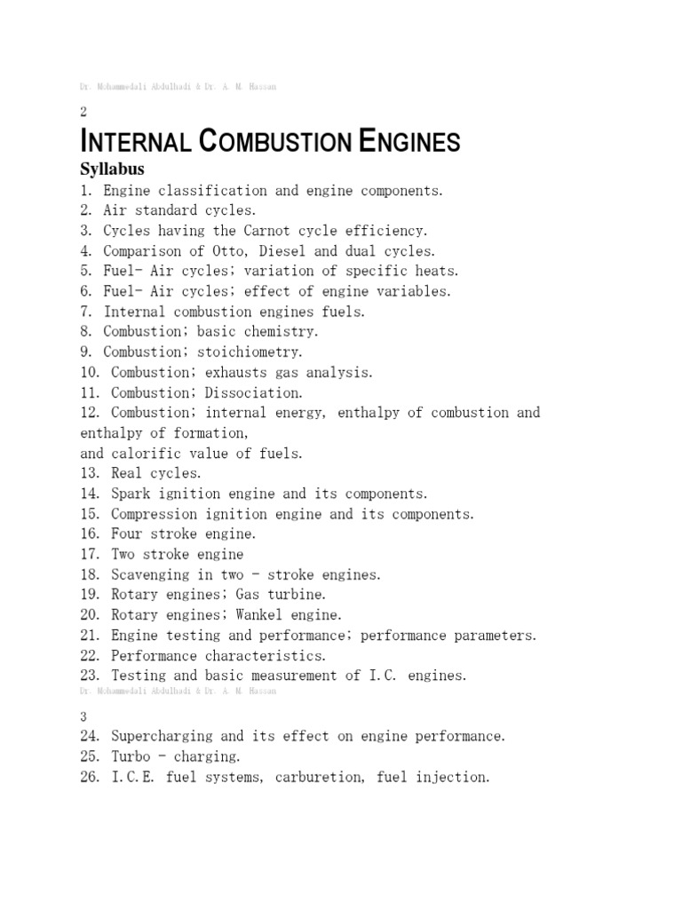 27. Valves (ports) timing. 28. Firing order. References: 1. - : . . . : . : - . 2. - : : . : - . 3. Internal combustion engines and air pollution by: E.F.Obert Publisher: intext educational publishers (1973). 4. Internal combustion engine fundamentals, by: John Heywood, pub.: McGraw- Hill (1988) - USA. 5. Internal combustion engines Applied Thermodynamics, by: Colin R Ferguson and Allan T. Kirkpatrick, pub.: John Wiley & sons 2001. 6. Introduction to internal combustion engines, by: Richard stone, pub.: MacMillan (1992) - USA. 7. A course in internal combustion engines, by: M. L. Mathur And R.P. Sharma, pub.: Dhanpat Rai& sons- India. 8. Internal combustion engines, by: H. B .Keswani, pub.: Standard Book House-India. 9. Internal combustion engines. Theory and Practice, by: S .P. Sen, pub.: Khanna publishers- India. 10.The internal combustion engines in theory and practice, 2 vols. by: C. F. Taylor, pub.: Wily.
