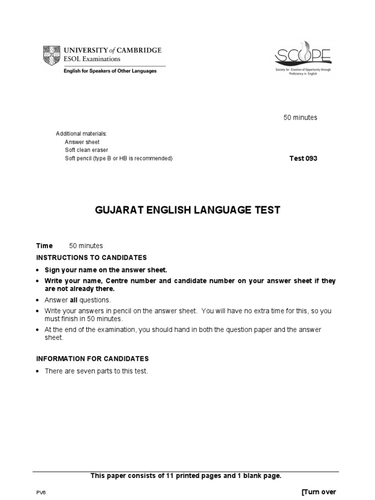 INSTRUCTIONS TO CANDIDATES Sign your name on the answer sheet. Write your name, Centre number and candidate number on your answer sheet if they are not already there. Answer all questions. Write your answers in pencil on the answer sheet. You will have no extra time for this, so you must finish in 50 minutes. At the end of the examination, you should hand in both the question paper and the answer sheet. INFORMATION FOR CANDIDATES There are seven parts to this test.
