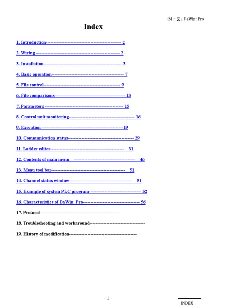 1. Introduction------------------------------------------------- 2 2. Wiring ----------------------------------------------------- 2 3. Installation--------------------------------------------------- 3 4. Basic operation----------------------------------------------- 7 5. File control-------------------------------------------------- 9 6. File comparisons---------------------------------------------- 13 7. Parameters --------------------------------------------------- 15 8. Control unit monitoring------------------------------------------- 16 9. Execution -----------------------------------------------------19 10. Communication status------------------------------------------- 29 11. Ladder editor------------------------------------------------ 31 12. Contents of main menu ---------------------------------------- 46 13. Menu tool bar------------------------------------------------ 51 14. Channel status window----------------------------------------- 51 15. Example of system PLC program---------------------------------- 52 16. Characteristics of DaWin_Pro------------------------------------- 56 17. Protocol --------------------------------------------------18. Troubleshooting and workaround-----------------------------------19. History of modification--------------------------------------------