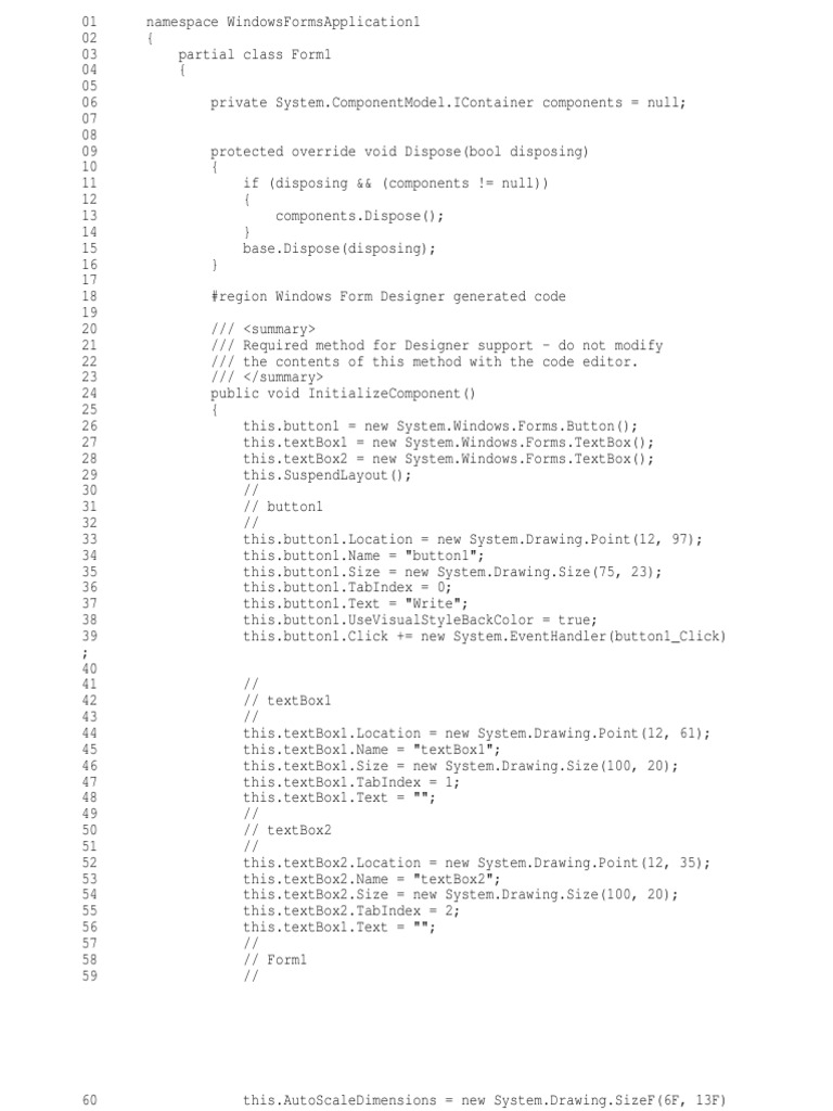 namespace WindowsFormsApplication1 { partial class Form1 { private System.ComponentModel.IContainer components = null; protected override void Dispose(bool disposing) { if (disposing && (components != null)) { components.Dispose(); } base.Dispose(disposing); } #region Windows Form Designer generated code /// <summary> /// Required method for Designer support - do not modify /// the contents of this method with the code editor. /// </summary> public void InitializeComponent() { this.button1 = new System.Windows.Forms.Button(); this.textBox1 = new System.Windows.Forms.TextBox(); this.textBox2 = new System.Windows.Forms.TextBox(); this.SuspendLayout(); // // button1 // this.button1.Location = new System.Drawing.Point(12, 97); this.button1.Name = "button1"; this.button1.Size = new System.Drawing.Size(75, 23); this.button1.TabIndex = 0; this.button1.Text = "Write"; this.button1.UseVisualStyleBackColor = true; this.button1.Click += new System.EventHandler(button1_Click) // // textBox1 // this.textBox1.Location = new System.Drawing.Point(12, 61); this.textBox1.Name = "textBox1"; this.textBox1.Size = new System.Drawing.Size(100, 20); this.textBox1.TabIndex = 1; this.textBox1.Text = ""; // // textBox2 // this.textBox2.Location = new System.Drawing.Point(12, 35); this.textBox2.Name = "textBox2"; this.textBox2.Size = new System.Drawing.Size(100, 20); this.textBox2.TabIndex = 2; this.textBox1.Text = ""; // // Form1 //