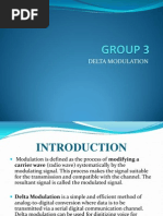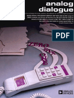 Delta modulation has evolved into a simple, efcient method of digitizing voice for secure, reliable communications and for voice I/O in data processing. To illustrate basic principles, a very simple delta modulator and demodulator are illustrated in Figure 1. The modulator is a sampled data system employing a negative feedback loop. A comparator senses whether or not the instantaneous level of the analog voice input is greater or less than the feedback signal. The comparator output is clocked by a ip-op to form a continuous NRZ digital data stream. This digital data is also integrated and fed back to the comparator. The feedback system is such that the integrator ramps up and down to produce a rough approximation of the input waveform. An identical integrator in the demodulator produces the same waveform, which when ltered, reproduces the voice. One can see that the digital data 0s and 1s are commands to the integrators to go up or go down respectively. Another way of looking at it is that the digital data stream also has analog signicance; it approximates the differential of the voice, since analog integration of the data reproduces the voice. Note that the integrator output never stands still; it always travels either up or down by a xed amount in any clock period. Because of its xed integrator output slope, the simple delta modulator is less than ideal for encoding human voice which may have a wide dynamic amplitude range. The integrator cannot track large, high frequency signals with its xed slope. Fortunately, human speech has statistically smaller amplitudes at higher frequencies, therefore an integrator time constant of about 1ms will satisfactorily reproduce voice in a 3kHz bandwidth. A more serious limitation is that voice amplitude changes which are less than the height of the integrator ramp during one clock period cannot be resolved. So dynamic range is proportional to clock frequency, and satisfactory range cannot be obtained at desirable low clock rates. A means of effectively increasing dynamic range is called companding (compressing-expanding); where at the modulator, small signals are given higher relative gain, and an inverse characteristic is produced at the demodulator. The CVSD: A popular effective scheme for companded delta modulation is known as CVSD (continuously variable slop deltamod) shown in Figure 2. Additional digital logic, a second integrator, and an analog multiplier are added to the simple modulator. Under small input signal conditions, the second integrator (known as the syllabic lter) has no input, and circuit function is identical to the simple modulator, except that the multiplier is biased to output quite small ramp amplitudes giving good resolution to the small signals. A larger signal input is characterized by consecutive strings of 1s or 0s in the data as the integrator attempts to track the input. The logic input to the syllabic lter actuates whenever 3 or more consecutive 0s or 1s are present in the data. When this happens, the syllabic lter output starts to build up increasing the multiplier gain, passing larger amplitude ramps to the comparator, enabling the system to track the larger signal. Up to a limit, the more consecutive 1s or 0s generated, the larger the ramp amplitude. Since the larger signals increase the negative feedback of the modulator and the forward gain of the demodulator, companding takes place. By listening tests, the syllabic lter time constant of 4 to 10ms is generally considered optimum. An outstanding characteristic of CVSD is its ability, with fairly simple circuitry, to transmit intelligible voice at relatively low data rates. Companded PCM, for telephone quality transmission, requires about 64K bits/sec data rate per channel. CVSD produces equal quality at 32K bits/sec. (However, at this rate it does not handle tone signals or phase encoded modern transmissions as well.) CVSD is useful at even lower data rates. At 16K bits/sec the reconstructed voice is remarkably natural, but has a slightly Fuzzy Edge. At 9.6K bits/sec intelligibility is still excellent, although the sound is reminiscent of a damaged loudspeaker. Of course, very sophisticated speech compression techniques have been used to transmit speech at even lower data rates; but CVSD is an excellent compromise between circuit simplicity and bandwidth economy.