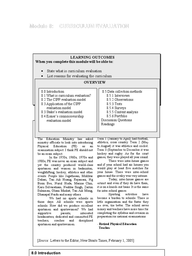 LEARNING OUTCOMES When you complete this module will be able to: State what is curriculum evaluation List reasons for evaluating the curriculum Explain the characteristics of the CIPP model OVERVIEW Describe the features of Stakes model of curriculum evaluation Explain the characteristics of Eisners model 8.0 Introduction 8.5Connoisseurship Data collection methods 8.1 is curriculum evaluation? 8.5.1 Interviews What Compare the different instruments of data collection