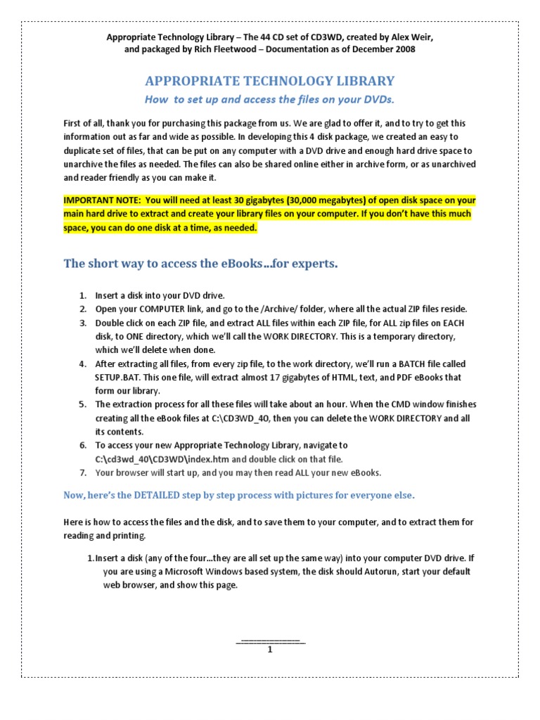 Appropriate Technology Library The 44 CD set of CD3WD, created by Alex Weir, and packaged by Rich Fleetwood Documentation as of December 2008 At this point youll be using 13.3 gigabytes of disk space on your system for the temporary files. NOW you are ready to run the SETUP.BAT file, to create the final HTML, TXT, and PDF files that you will finally be able to read. If you run the batch file (.BAT), it will extract ALL exe files, defaulting to your C:\, or root, drive. It will create a folder called C:\CD3WD Upon double clicking on the BAT file, the CMD (command) run window of Windows will show a box like this.