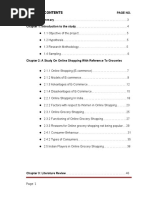 CHAPTER NO 1 INTRODUCTION EXECUTIVE SUMMERY RESEARCH OBJECTIVES RESEARCH DESIGN AND METHODOLOGY SCOPE OF THE RESEARCH 2 BACKGROUND OF TOPIC INDUSTRY INTRODUCTION MODELS OF E-COMMERCE ONLINE SHOPPING IN INDIA ONLINE GROCERY SHOPPING INDIAN PLAYERS IN ONLINE GROCERY SHOPPING 3 PROFILE OF THE ORGANISATION IMRB INTERNATIONAL 4 5 ANALYSIS OF DATA CONCLUSION AND OBSERVATION OBSERVATION CONC LUS ION 6 APPENDICES QUESTIONNAIRE BIBLIOGRAPHY 38 42 19 21 36 37 6 7 10 12 15 1 3 4 5 CHAPTER NAME PAGE NO