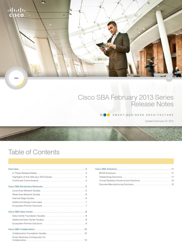 Cisco Smart Business Architecture (SBA) helps you design and quickly deploy a full-service business network. An SBA deployment is prescriptive, out-of-the-box, scalable, and flexible. We update Cisco SBA guides on a regular basis. As we develop a new series of guides, we test them together, as a complete system. To ensure the mutual compatibility of designs in Cisco SBA guides, you should use guides that belong to the same series. The February 2013 Series is the Cisco SBA release for the first half of the 2013 calendar year. The February 2013 Series release supersedes the August 2012 Series. You can access all the guides that are listed in this document by visiting http://www.cisco.com/go/sba. For your convenience, each guide heading in these release notes is a hyperlink to the guide online. Cisco SBA guides are best viewed with Adobe Acrobat Reader.