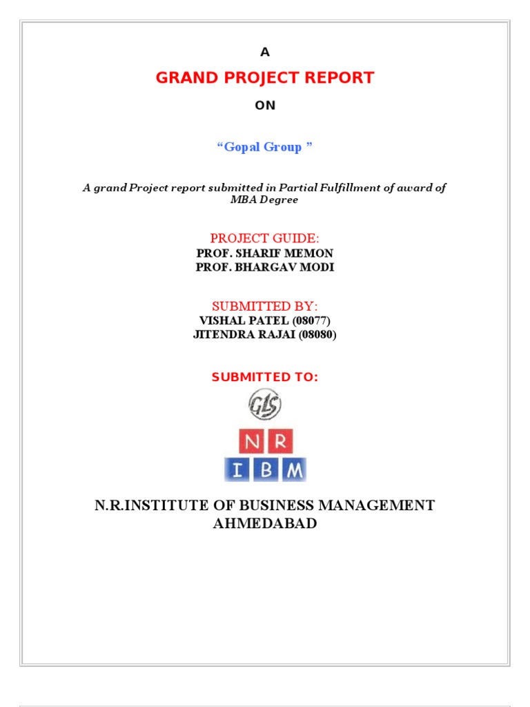 This is to certify that Mr. Vishal Patel and Mr. Jitendra Rajai the students of MBA 2nd year of N.R. Institute of Business Management, Ahmedabad have completed their Grand Project Gopal Group in the year 2008-2010 in partial fulfillment of Gujarat University requirements for the award of the degree of Master of Business Administration.