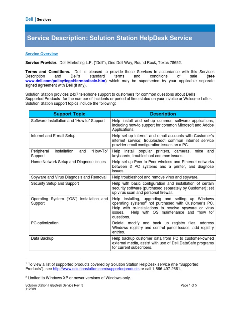 Service Overview Service Provider. Dell Marketing L.P. (Dell), One Dell Way, Round Rock, Texas 78682. Terms and Conditions. Dell is pleased to provide these Services in accordance with this Services Description and Dell's standard terms and conditions of sale (see www.dell.com/policy/legal/termsofsale.htm) which may be superseded by your applicable separate signed agreement with Dell (if any). Solution Station provides 24x7 telephone support to customers for common questions about Dell's 1 Supported Products for the number of incidents or period of time stated on your invoice or Welcome Letter. Solution Station support topics include the following: