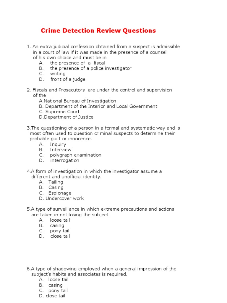 1. An extra judicial confession obtained from a suspect is admissible in a court of law if it was made in the presence of a counsel of his own choice and must be in A. the presence of a fiscal B. the presence of a police investigator C. writing D. front of a judge 2. Fiscals and Prosecutors are under the control and supervision of the A.National Bureau of Investigation B. Department of the Interior and Local Government C. Supreme Court D.Department of Justice 3.The questioning of a person in a formal and systematic way and is most often used to question criminal suspects to determine their probable guilt or innocence. A. Inquiry B. Interview C. polygraph examination D. interrogation 4.A form of investigation in which the investigator assume a different and unofficial identity. A. Tailing B. Casing C. Espionage D. Undercover work 5.A type of surveillance in which extreme precautions and actions are taken in not losing the subject. A. loose tail B. casing C. pony tail D. close tail