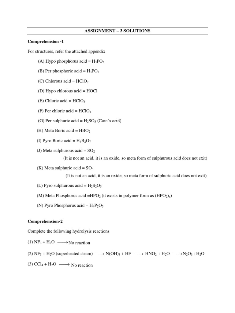 ASSIGNMENT 3 SOLUTIONS Comprehension -1 For structures, refer the attached appendix (A) Hypo phosphorus acid = H3PO2 (B)