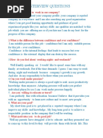 me when I was depressed. I don't think without my mother I will be what I am now. I love my mom. 21. What was the toughest decision you ever had to make? ans: -My toughest decision was to choose between higher education and job. I choose job because getting more practical knowledge rather than theoretical knowledge is more important for a better carrier. My toughest decision is whether to choose higher studies for search for a job. I chosen job because getting trained is better than educated. Any decision depends on situation, taking correct decision at a situation is the toughest job, and the decision taken should be beneficial. 22. Have you considered starting your own business? ans:- Being a Fresher, I don't have any idea about it. Also, before being a Good Businessman, you have to be good Employee. At present, I just want to improve my skills and experience in the field of Working. Later, considering my financial Conditions, market status,etc., I'll think about it. As a fresher I did not think much about that one right now. I just want to improve my skills and work experienc. Later I will think about that. Because a good business man must be a good employee then only he can run the organisation successfully. 23. How do you define success and how do you measure up to your own definition? Ans: "succees" to me is doing something that I always wanted to do. No one else can measure my success except myself because success is related to mental satisfaction. Success is not about money as per my thinking. ans:- Sir, I think every person has a different meaning of success like if a student get a good marks in examination that is successful for him and if parents can bring happiness in their child's life that is success for them. So I think success means you satisfied with your work. 24. If you won $10 million lottery, would you still work? Ans:- Yes I will work why because the money without any effort will not give me any satisfaction. The money which I have earned with my hard work will make me happy. Money will not make me to learn new things but hard work will teach us how earn more tham $10million. Yes I will work continue because money does not teach how to earn more money but your company teach me how to convert 10 million into 100 million. I won't leave because money will not teach anything but our company will teach how to earn more than $10 million money. So I will continue my work. 25. Tell me something about our company. ans: -It's one of the reputed company. Then recent projects and achievements leads to company performance. Its is well growing company in global. And I'm sure that this company going to successfully growth. This question is not at all tough to answer just go through company profile and frame few good points about company, company chairman, MD. One thing current project company working on and moreover company's contribution on particular sector. Keeping these points in view one can easily give best answer to this question. A good answer will reflect that yes, you are interested in particular company.