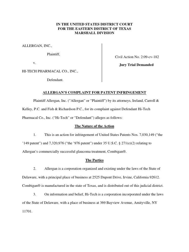 ALLERGAN’S COMPLAINT FOR PATENT INFRINGEMENT