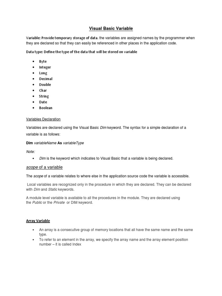 Variables Declaration Variables are declared using the Visual Basic Dim keyword. The syntax for a simple declaration of a variable is as follows: Dim variableName As variableType Note: Dim is the keyword which indicates to Visual Basic that a variable is being declared.
